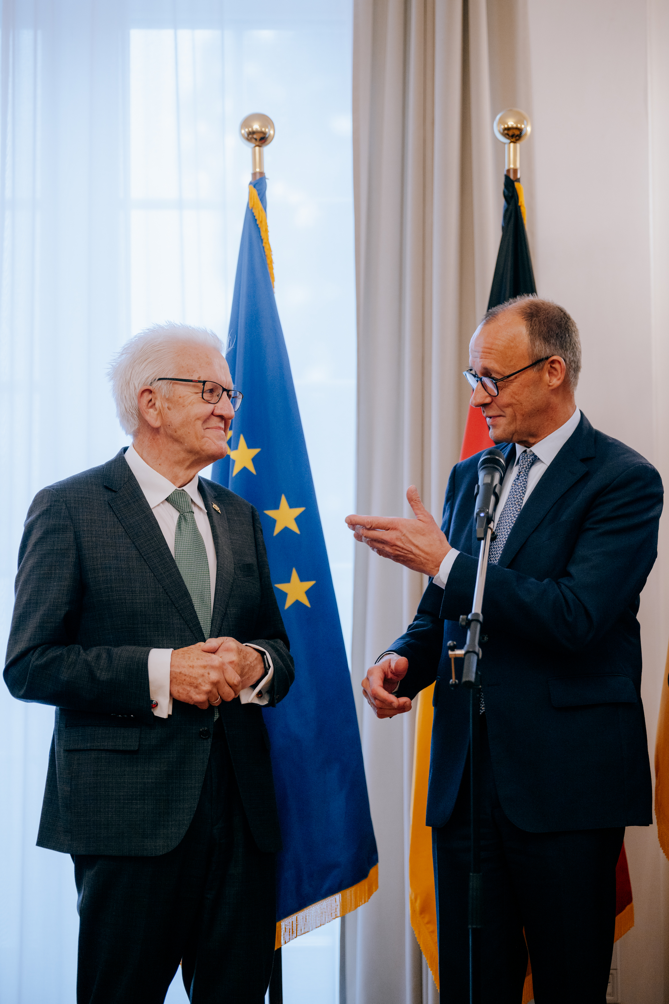 Bundeskanzler Friedrich Merz ist im Rahmen eines Antrittsbesuchs am Dienstag, 21. Oktober 2025, nach Baden-Württemberg gekommen. Ministerpräsident Winfried Kretschmann begrüßte ihn in der Villa Reitzenstein in Stuttgart, wo er zusammen mit dem Staatsminister für Bund-Länder-Zusammenarbeit, Dr. Michael Meister, eine Kabinettssitzung besuchte. Im Anschluss begaben sich der Bundeskanzler und der Ministerpräsident zum Spatenstich für Europas größten KI-Innovationspark, dem IPAI CAMPUS in Heilbronn.