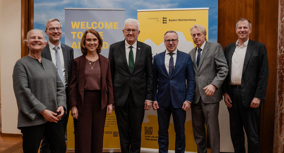Ministerpräsident Winfried Kretschmann und Wissenschaftsministerin Petra Olschowski haben am Mittwoch, 28. Januar 2026, in Stuttgart die Gründungsvereinbarung für das Graduierten- und Forschungszentrum connAIx unterschrieben.